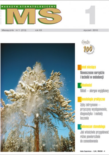 Temat miesiąca styczniowego numeru pisma poświęciliśmy nowoczesnym narzędziom i technikom stosowanym w endodoncji. Ta dziedzina współczesnej stomatologii budzi żywe zainteresowanie Czytelników – świadectwem jest liczny Państwa udział w organizowanych przez redakcję kursach doskonalących „Endodoncja praktyczna od A do Z”. W dziale pomieściliśmy prace kazuistyczne, poglądowe i badawcze z różnych ośrodków akademickich na temat opracowania kanałów korzeniowych narzędziami rotacyjnymi Bio‑RaCe, zamknięcia perforacji korzenia od zewnątrz materiałem MTA, zastosowania magnetostymulacji w leczeniu przewlekłego zapalenia tkanek okołowierzchołkowych, nowoczesnych metod wypełniania kanałów korzeniowych oraz porównania skuteczności wypełniania kanałów korzeniowych z deformacją w postaci klepsydry dwiema metodami – kondensacji bocznej i techniką Thermafil.