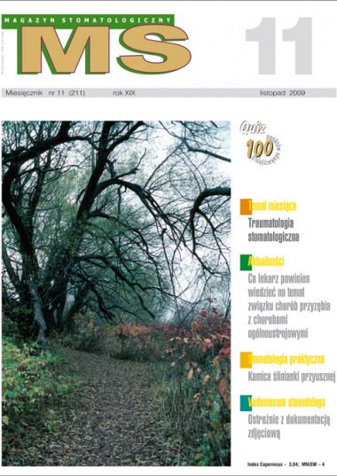 Magazyn Stomatologiczny, 11/2009 Zobacz pozostałe numery W numerze: Temat miesiąca: Traumatologia stomatologiczna Aktualności: Co lekarz powinien wiedzieć na temat związku chorób przyzębia z chorobami ogólnoustrojowymi? Stomatologia praktyczna: Kamica ślinianki przyusznej. Opis przypadku Vademecum stomatologa: Ostrożnie z dokumentacją zdjęciową