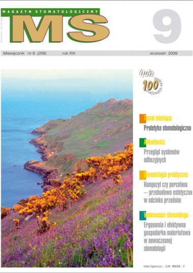 Magazyn Stomatologiczny, 9/2009 Zobacz pozostałe numery W numerze: Temat miesiąca: Protetyka stomatologiczna Aktualności: Przegląd systemów adhezyjnych na podstawie piśmiennictwa. Część II Stomatologia praktyczna: Zabiegi stomatologiczne w znieczuleniu ogólnym w materiale Katedry i Zakładu Stomatologii Wieku Rozwojowego Uniwersytetu Medycznego w Lublinie – obserwacja roczna Vademecum stomatologa: Ergonomia i efektywna gospodarka materiałowa w nowoczesnej stomatologii