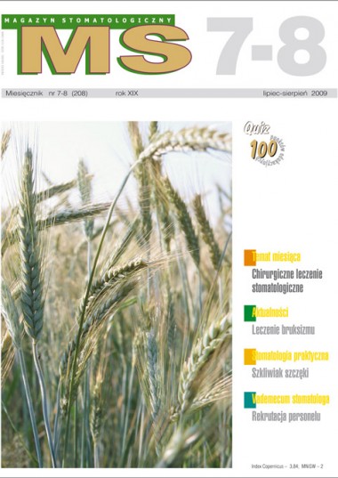 Magazyn Stomatologiczny, 7-8/2009 Zobacz pozostałe numery W numerze: Temat miesiąca: Chirurgiczne leczenie stomatologiczne Aktualności: Leczenie bruksizmu (część II) Stomatologia praktyczna: Rzadki przypadek. Szkliwiak szczęki Vademecum stomatologa: Rekrutacja jako element zarządzania personelem gabinetu stomatologicznego