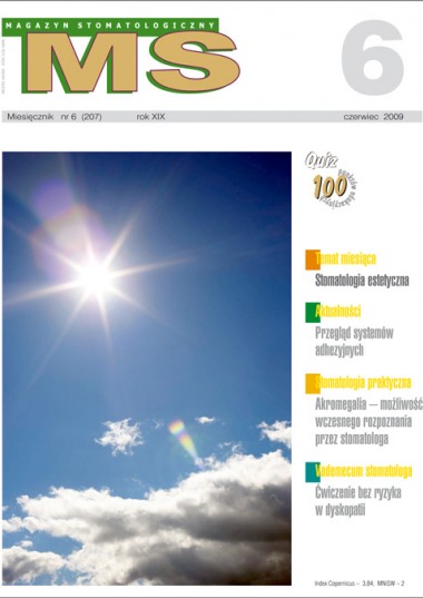 Magazyn Stomatologiczny, 6/2009 Zobacz pozostałe numery W numerze: Temat miesiąca: Stomatologia estetyczna Aktualności: Przegląd systemów adhezyjnych na podstawie piśmiennictwa. Część I Stomatologia praktyczna: Biofilm w kanałach korzeniowych w świetle piśmiennictwa Vademecum stomatologa: Ćwiczenie bez ryzyka w dyskopatii