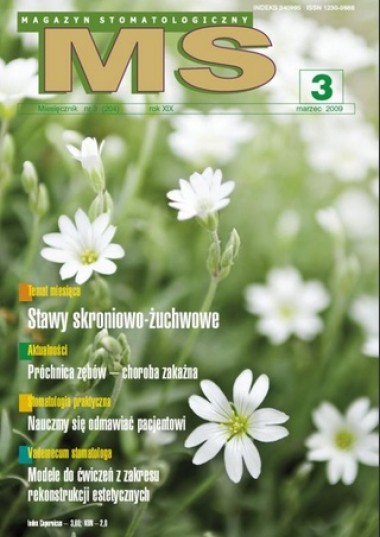 Magazyn Stomatologiczny, 3/2009 Zobacz pozostałe numery W numerze: Temat miesiąca: Stawy skroniowo-żuchwowe Aktualności: Próchnica zębów – choroba zakaźna. Część II. Transmisja i zasiedlanie jamy ustnej przez bakterie próchnicotwórcze Stomatologia praktyczna: Nauczmy się odmawiać pacjentowi Vademecum stomatologa: Modele do ćwiczeń z zakresu rekonstrukcji estetycznych