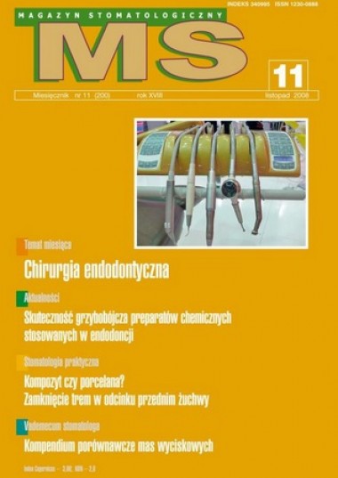 Magazyn Stomatologiczny, 11/2008 Zobacz pozostałe numery W numerze: Temat miesiąca: Chirurgia endodontyczna Aktualności: Skuteczność grzybobójcza preparatów chemicznych stosowanych w endodoncji (na podstawie dostępnego piśmiennictwa) Stomatologia praktyczna: Kompozyt czy porcelana? Zamknięcie trem w odcinku przednim żuchwy Vademecum stomatologa: Kompendium porównawcze mas wyciskowych. Część II