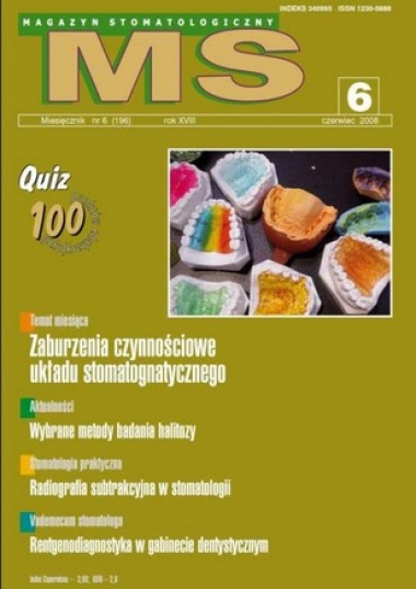 Magazyn Stomatologiczny, 6/2008 Zobacz pozostałe numery W numerze: Temat miesiąca: Zaburzenia czynnościowe układu stomatologicznego Aktualności: Wybrane metody badania halitozy Stomatologia praktyczna: Radiografia subtrakcyjna w stomatologii – przegląd piśmiennictwa Vademecum stomatologa: Rentgenodiagnostyka w gabinecie dentystycznym