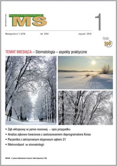 Pierwszy numer „Magazynu Stomatologicznego” w 2016 roku jest poświęcony PRAKTYCZNYM ASPEKTOM STOMATOLOGII. Ja polecam Państwu szczególnie opis leczenia pacjentki z zatrzymanym atypowym zębem 21, u której zastosowano zakotwienie szkieletowe, a także pracę poświęconą trudnościom diagnostycznym w przypadku występowania przewlekłych zmian nadżerkowych w jamie ustnej w przebiegu tocznia rumieniowatego oraz opis ekstrakcji trzeciego zęba trzonowego górnego powikłanej odłamaniem guza szczęki i krwawieniem podspojówkowym – streszczenie artykułu zagranicznego.