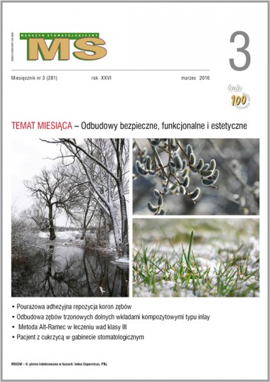 Temat miesiąca bieżącego numeru „Magazynu Stomatologicznego” brzmi bardzo intrygująco - ODBUDOWY BEZPIECZNE, FUNKCJONALNE I ESTETYCZNE. Składają się na niego wyłącznie opisy przypadków. Mnie zachwyciły, głównie ze względu na piękną dokumentację oraz mistrzowskie wykonanie, adhezyjna repozycja koron zębów oraz rekonstrukcja zębów trzonowych dolnych wkładami kompozytowymi typu inlay. Pod koniec numeru, jak zawsze, streszczenie ciekawego artykułu z piśmiennictwa światowego, tym razem dotyczącego zamierzonej replantacji zęba z perforującą resorpcją zewnętrzną korzenia, a także porady prawne dotyczące między innymi podatków w 2016 r.