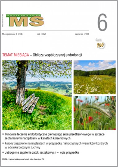 Tematem miesiąca bieżącego numeru są OBLICZA WSPÓŁCZESNEJ ENDODONCJI, na który składają się 4 bardzo interesujące artykuły. Trzy z tych prac to opisy przypadków i dotyczą kompleksowego leczenia endodontyczno protetycznego zębów trzonowych, ponownego leczenia kanałowego pierwszego zęba przedtrzonowego w szczęce ze złamanymi narzędziami w kanałach korzeniowych oraz pionowego złamania korzenia zęba. Opisy ciekawych przypadków, w tym powikłań leczenia stomatologicznego, znalazły się także w dziale STOMATOLOGIA PRAKTYCZNA. Mnie zainteresowały szczególnie opis jatrogennego zapalenia zatoki szczękowej w następstwie wtłoczenia narzędzia do jej światła, a także prezentacja postępowania w przypadku potetracyklinowaego przebarwienia zębów przednich, choć równie interesująca jest praca dotycząca rekonstrukcji protetycznych w postaci koron zespolonych na implantach w przypadku niekorzystnych warunków kostnych w odcinku bocznym żuchwy czy też fotoreportaż na temat nowoczesnej diagnostyki radiologicznej. Jak zawsze, pod koniec numeru omówienie artykułu z piśmiennictwa światowego. Tym razem jest to opis trudnego do zdiagnozowania przewlekłego obrzęku tkanek spowodowanego pozostawieniem żywicy akrylowej w zębodole poekstrakcyjnym.