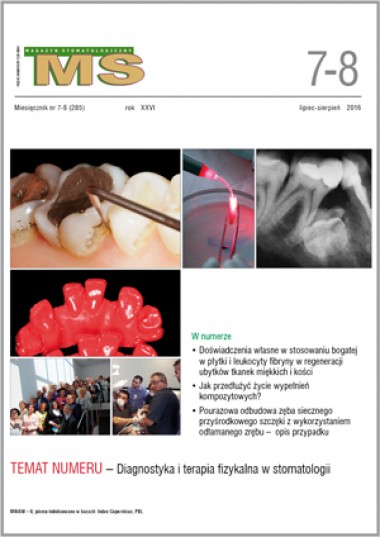 Temat miesiąca wakacyjnego numeru „Magazynu Stomatologicznego” dotyczy diagnostyki i terapii fizykalnej w stomatologii. Znajdą w nim Państwo m.in. artykuły poświęcone zastosowaniu fizykoterapii w codziennej praktyce lekarza stomatologa oraz terapii światłem spolaryzowanym w rehabilitacji pacjentów z dysfunkcją układu ruchowego narządu żucia, a także skuteczności dezynfekcji kanałów korzeniowych za pomocą różnych technik laseroterapii. W temacie miesiąca i w dalszej części czasopisma znalazły się jak zawsze chętnie przez Państwa czytane opisy przypadków. Tym razem to m.in. odbudowa wrodzonego braku zawiązków drugich zębów siecznych w żuchwie za pomocą kompozytu wzmacnianego włóknem szklanym czy też prezentacja pourazowej odbudowy zęba siecznego przyśrodkowego szczęki z wykorzystaniem odłamanego zrębu. Jak zawsze, pod koniec numeru omówienie artykułu z piśmiennictwa światowego.