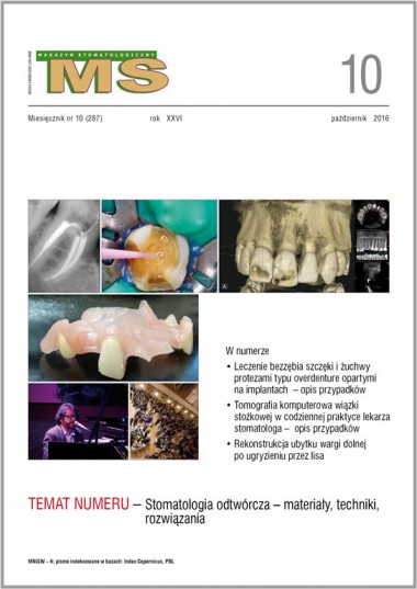 Tematem miesiąca bieżącego numeru jest STOMATOLOGIA ODTWÓRCZA – MATERIAŁY, TECHNIKI I ROZWIĄZANIA, na który składają się 4 interesujące artykuły. Mnie szczególnie zaciekawił opis przypadku rehabilitacji protetycznej pacjenta ze złamaniem poddziąsłowym koron zębów w strefie estetycznej z użyciem zarówno wkładów, jak i koron protetycznych, do których wykonania zastosowano złoto, a także praca prezentująca leczenie bezzębia z użyciem protez overdenture. Natomiast w dziale STOMATOLOGIA PRAKTYCZNA moją uwagę przykuł artykuł prezentujący przypadki, w których zastosowano tomografię komputerową wiązki stożkowej oraz publikacja dotycząca zębów zatrzymanych u pacjentów w podeszłym wieku.