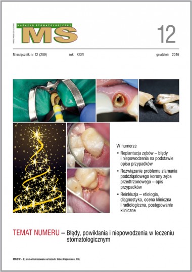 Ostatni tegoroczny numer „Magazynu Stomatologicznego” dotyczy BŁĘDÓW, POWIKŁAŃ I NIEPOWODZEŃ W LECZENIU STOMATOLOGICZNYM. Trzy prace z 4 zamieszczonych w temacie miesiąca to opisy przypadków. Mnie szczególnie zainteresowała praca prezentująca błędy i niepowodzenia replantacji zębów oraz publikacja dotycząca jatrogennego porażenia nerwu zębodołowego dolnego i nerwu językowego. Natomiast w dziale STOMATOLOGIA PRAKTYCZNA zamieściliśmy m.in. ciekawą pracę dotyczącą możliwości kształtowania powierzchni ciernej cylindrycznych zaczepów teleskopowych oraz prace typu CASE SHOW prezentujące: trudne przypadki leczenia endodontycznego i addycyjną technikę odbudowy filaru korony zęba leczonego endodontycznie w powtórnym leczeniu odtwórczym.