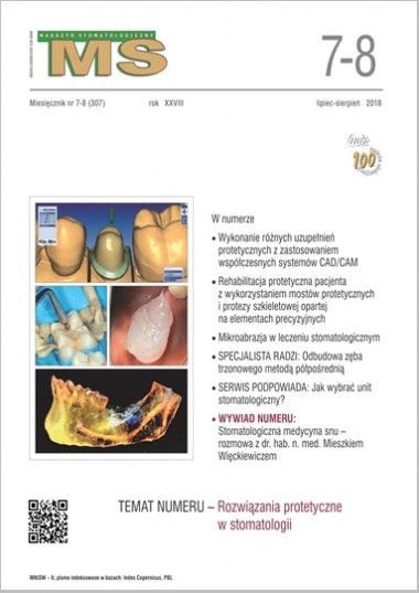 tematem miesiąca wakacyjnego numeru „Magazynu Stomatologicznego” jest szeroko rozumiana protetyka stomatologiczna. Zagadnienie to prezentują m.in. artykuły poświęcone systemom CAD/CAM. Opisano w nich materiały stosowane do wykonywania uzupełnień w tych systemach, ukazano ich zalety i wady oraz kierunki dalszego rozwoju, przedstawiono także przykłady konkretnych zastosowań w praktyce klinicznej. W temacie miesiąca znajdą Państwo ponadto dwie ciekawe prace kazuistyczne – pierwsza z nich dotyczy rehabilitacji protetycznej pacjenta z wykorzystaniem mostów protetycznych i protezy szkieletowej opartej na elementach precyzyjnych, druga zaś przedstawia leczenie protetyczne pacjenta po okaleczającym zabiegu chirurgicznym z powodu nowotworu jamy ustnej.