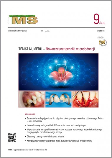 w tym miesiącu tematem przewodnim „Magazynu Stomatologicznego” są NOWOCZESNE TECHNIKI W ENDODONCJI. Pierwsza z trzech prac, które znalazły się w tym dziale, dotyczy zamknięcia rozległej perforacji z użyciem bioaktywnego materiału odtwórczego, druga to opis dwóch przypadków leczenia endodontycznego z wykorzystaniem lasera o długości fali 810 nm, trzecia zaś prezentuje wykorzystanie tomografii wolumetrycznej podczas ponownego leczenia kanałowego drugiego zęba przedtrzonowego szczęki. Praktyczne prace zamieściliśmy także w pozostałych działach czasopisma. Ja rekomenduję Państwu pracę dotyczącą zamykania diastem i trem oraz reportaż kliniczny przedstawiający pojedynczą rekonstrukcję zęba przedniego. Zachęcam Państwa również do lektury działu VADEMECUM STOMATOLOGA. Tym razem znalazły się w nim między innymi artykuły poświęcone interdyscyplinarnemu leczeniu wad zgryzu oraz kamieniom milowym w historii endodoncji. Jak zawsze pod koniec numeru omówienie artykułu zagranicznego; tym razem opisu przypadku aspiracji ciała obcego podczas leczenia stomatologicznego w znieczuleniu ogólnym.