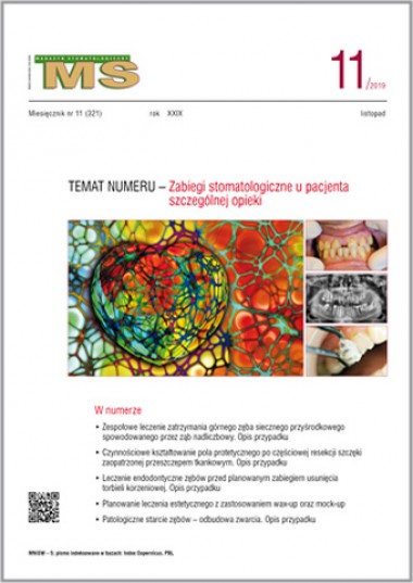 tematem miesiąca listopadowego numeru „Magazynu Stomatologicznego” są ZABIEGI STOMATOLOGICZNE U PACJENTA SZCZEGÓLNEJ OPIEKI. Jedna z zamieszczonych w tym dziale prac dotyczy interdyscyplinarnego leczenia stomatologicznego pacjenta po radioterapii w obrębie głowy i szyi. Ponadto przeczytacie Państwo opis czynnościowego kształtowania pola protetycznego po częściowej resekcji szczęki zaopatrzonej przeszczepem tkankowym, czy też zapoznacie się z prezentacją przypadku implantacji natychmiastowej u pacjentki leczonej z powodu osteoporozy lekami z grupy bisfosfonianów. Równie interesujące artykuły zamieściliśmy w pozostałych działach czasopisma. Są to prace typu „case show”, krok po kroku prezentujące postępowanie w wybranych sytuacjach klinicznych. I tak jedna z tych prac opisuje zamknięcie diastemy z użyciem uniwersalnego kompozytu, kolejna planowanie leczenia estetycznego z zastosowaniem wax‑up oraz mock‑up, a następna – zachowawczą odbudowę przetrwałego zęba mlecznego, przy czym wszystkie posiadają doskonałą dokumentację fotograficzną.
