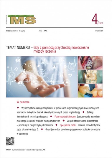 kwietniowy numer MAGAZYNU STOMATOLOGICZNEGO dotyczy nowoczesnych metod leczenia w stomatologii. Pierwsza z czterech prac, które znalazły się w TEMACIE MIESIĄCA, dotyczy odtworzenia całkowitego braku miejsca dla drugiego zęba przedtrzonowego w szczęce za pomocą stałych aparatów grubołukowych. Kolejne dwie prace to również opisy przypadków: jedna z nich dotyczy wykorzystania autogennej tkanki w procedurach augmentacyjnych zwiększających szerokość i objętość tkanek skeratynizowanych przed implantacją, a druga frenulektomii, którą wykonano zarówno z użyciem skalpela, jak i lasera diodowego, uzyskując w efekcie wyraźną poprawę funkcji i estetyki przy jednoczesnym braku powikłań okołozabiegowych. Dział zamyka badanie oceniające efektywność technik manualnych i plastrowania dynamicznego w redukcji powikłań pooperacyjnych po leczeniu chirurgicznym w obrębie twarzowej części czaszki i szyi.