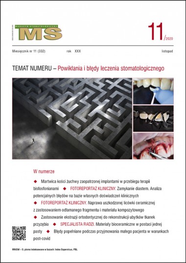tematem miesiąca listopadowego numeru „Magazynu Stomatologicznego” są POWIKŁANIA I BŁĘDY LECZENIA STOMATOLOGICZNEGO. Pierwszy z trzech artykułów tego działu przedstawia postępowanie w przypadku martwicy kości żuchwy zaopatrzonej implantami w przebiegu terapii bisfosfonianami, drugi potencjalne błędy, które lekarz może popełnić podczas zamykania diastem, trzeci zaś naprawę uszkodzonej licówki ceramicznej z zastosowaniem odłamanego fragmentu i materiału kompozytowego. Wszystkie prace mają bogatą dokumentację, a dwie ostatnie w szczególności, gdyż stanowią reportaż kliniczny omawianych procedur. W dziale STOMATOLOGIA PRAKTYCZNA moją uwagę zwrócił artykuł opisujący przypadek rekonstrukcji periodontologicznego ubytku kości oraz brodawki międzyzębowej z wykorzystaniem ekstruzji ortodontycznej.
