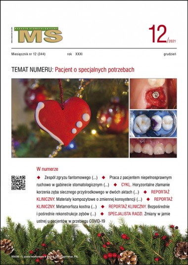 tematem miesiąca grudniowego numeru „Magazynu Stomatologicznego” jest PACJENT O SPECJALNYCH POTRZEBACH. W dziale tym zamieściliśmy dwie prace. Pierwsza z nich dotyczy phantom bite syndrome – rzadkiego schorzenia neurologicznego, druga zaś prezentuje problem leczenia stomatologicznego pacjenta niepełnosprawnego.
