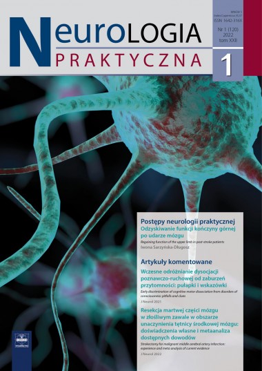 Resekcja martwej części mózgu (strokectomy) to chirurgiczne wycięcie poudarowego, zawałowego obszaru mózgu z zachowaniem integralności czaszki, w odróżnieniu od hemikraniektomii odbarczającej. Obie metody mogą ograniczać złośliwy zespół tętnicy środkowej mózgu (malignant middle cerebral artery – MCA), ale dowody dotyczące resekcji martwej części mózgu są skąpe. W niniejszym artykule autorzy przedstawiają swoje dane i metaanalizę dotyczącą resekcji ogniska zawałowego w porównaniu z hemikraniektomią w złośliwym zawale w obszarze unaczynienia MCA. Wszystkie przypadki złośliwego zawału w obszarze unaczynienia MCA, wymagające interwencji chirurgicznej w dużym ośrodku specjalistycznej opieki (od stycznia 2012 r. do grudnia 2017 r., n = 24), analizowano pod kątem średnicy kraniotomii, powikłań, czasu obserwacji i efektów końcowych ocenianych w Zmodyfikowanej skali Rankina (modified Rankin score – mRS). Dobry efekt końcowy definiowano jako mRS 0-3 po 12 miesiącach. W metaanalizie efekt końcowy po resekcji ogniska zawałowego (łącznie na podstawie danych kohorty autorów i opublikowanych badań) porównano z hemikraniektomią (dane o kohorcie autorów łącznie z opublikowanymi danymi z badań klinicznych DECIMAL, DESTINY i HAMLET). W opisywanej serii przypadków (n = 24, 12/12 K/M, średni wiek 45,83 ± 8,91 roku, zakres 29-63 lat) 4 pacjentów poddano resekcji martwej części mózgu (SC), a 20 hemikraniektomii (HC). U pacjentów poddanych SC średnica kraniotomii była mniejsza niż u pacjentów poddanych HC (odpowiednio 86 ± 13,10 mm, 120 ± 4,10 mm; p = 0,003), powikłania występowały rzadziej (25%, 55%) i zły efekt końcowy również rzadziej (25%, 70%). W zebranych danych (n = 41 SC, 71 HC) wykazano lepszy efekt końcowy resekcji ogniska zawałowego niż hemikraniektomii (OR 2,2;