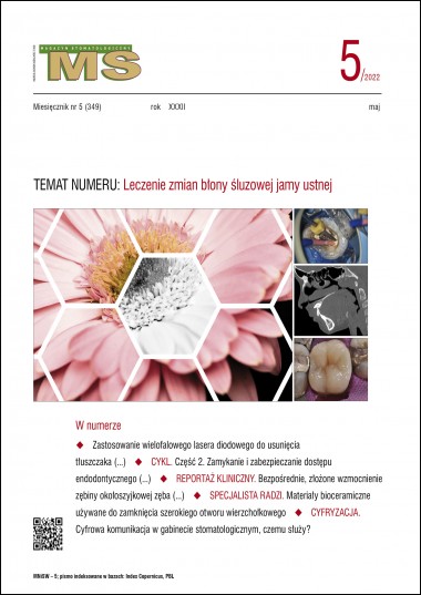 majowy numer „Magazynu Stomatologicznego” jest poświęcony LECZENIU ZMIAN BŁONY ŚLUZOWEJ JAMY USTNEJ. Wszystkie trzy prace, które zamieściliśmy w TEMACIE MIESIĄCA, to opisy przypadków. Pierwsza z nich to opis włókniaka urazowego zlokalizowanego na podniebieniu, druga prezentuje usunięcie tłuszczaka za pomocą wielofalowego lasera diodowego, trzecia zaś przedstawia zmiany w jamie ustnej w przebiegu COVID-19.