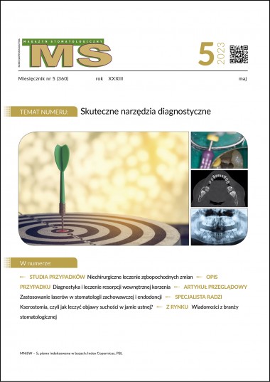 temat miesiąca majowego numeru „Magazynu Stomatologicznego” brzmi SKUTECZNE NARZĘDZIA DIAGNOSTYCZNE. Znajdą w nim Państwo trzy prace kazuistyczne: jedna z nich dotyczy chirurgicznego leczenia zęba z resorpcją wewnętrzną, druga to opis postępowaniaw przypadku rozległej torbieli zawiązkowej żuchwy,trzecia zaś przedstawia zachowawcze leczenie zębówz martwą miazgą, będących przyczyną zapalenia zatok szczękowych. Równie interesujące artykuły zamieściliśmy w pozostałych działach czasopisma. Ja rekomenduję Państwu opis przypadku nietypowej anatomii kanałów korzeniowych.
