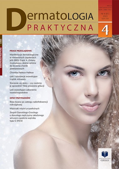 Trądzik różowaty to przewlekła choroba skóry dotykająca głównie kobiety. Obraz kliniczny choroby jest zróżnicowany, charakteryzuje się zaczerwienieniem, teleangiektazjami, obecnością grudek i zmian zapalnych w środkowej części twarzy. Chociaż dokładna patofizjologia nie została poznana, to można wymienić czynniki zaostrzające chorobę – ekspozycję na promienie UV, wysoką temperaturę czy stres. Ostatnie publikacje sugerują, że leki i witaminy stosowane na co dzień mogą indukować zmiany skórne w postaci trądziku różowatego. Celem tego artykułu jest przedstawienie aktualnej wiedzy na temat związku ze stosowaniem leku i substancji a występowaniem zmian na tle trądziku różowatego.