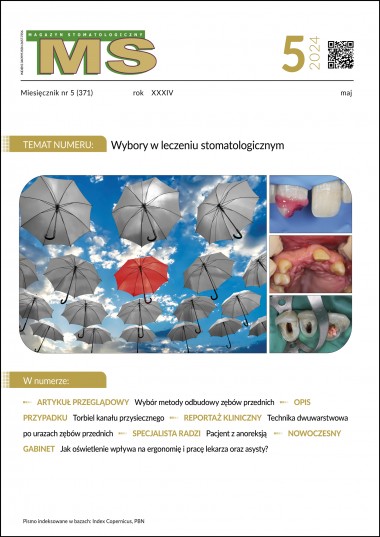 temat miesiąca majowego numeru „Magazynu Stomatologicznego” brzmi WYBORY W LECZENIU STOMATOLOGICZNYM. Znajdą w nim Państwo dwie prace. Mnie zainteresował artykuł przeglądowy dotyczący metod odbudowy zębów przednich po leczeniu endodontycznym w zależności od stopnia destrukcji tkanek twardych zębów.