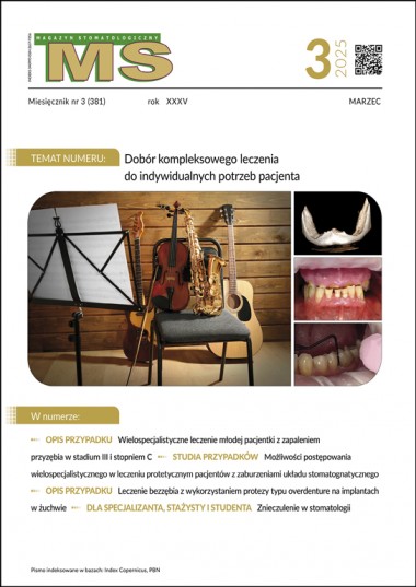 tematem miesiąca marcowego numeru „Magazynu Stomatologicznego” jest DOBÓR KOMPLEKSOWEGO LECZENIA DO INDYWIDUALNYCH POTRZEB PACJENTA. Znajdą w nim Państwo dwie prace kazuistyczne. Pierwsza z nich prezentuje możliwości postępowania wielospecjalistycznego w leczeniu protetycznym pacjentów z zaburzeniami układu stomatognatycznego, druga zaś opisuje wielospecjalistyczne leczenie młodej pacjentki z zapaleniem przyzębia w stadium III i stopniem C. Opisy przypadków zamieściliśmy także w dziale STOMATOLOGIA PRAKTYCZNA. Mnie szczególnie zainteresowała praca prezentująca leczenie bezzębia z wykorzystaniem protezy typu overdenture na implantach w żuchwie. Natomiast pod koniec numeru znajdą Państwo streszczenie artykułu zagranicznego opatrzone komentarzem specjalisty.